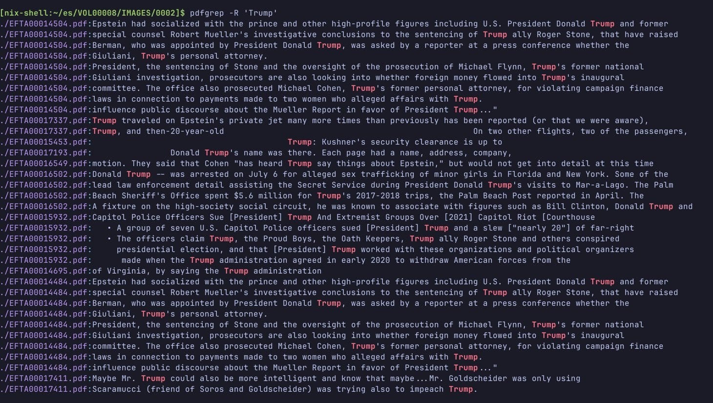 One particularly telling detail: searching the supposedly redacted documents for “Trump ” (with a space) returns over 600 hits—exactly the kind of result you’d expect from text that was never actually removed.