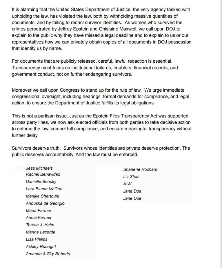They called on Congress to enforce the law immediately: “This is not a partisan issue. Just as the Epstein Files Transparency Act was supported across party lines, we now ask elected officials from both parties to take decisive action to enforce the law, compel full compliance, and ensure meaningful transparency without further delay.”