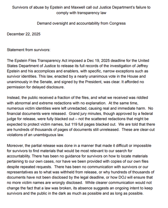 A group of alleged Epstein victims issued a scathing statement: “It is alarming that the United States Department of Justice, the very agency tasked with upholding the law, has violated the law, both by withholding massive quantities of documents, and by failing to redact survivor identities.”
