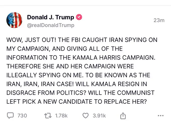 Donald Trump recently tweeted accusations that Iran was caught spying on his campaign and providing information to Kamala Harris’s campaign. He labeled this as the “Iran, Iran, Iran case,” questioning whether Kamala Harris should resign due to these allegations.