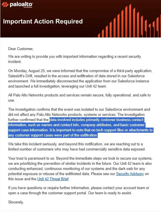 “We quickly contained the incident and disabled the application from our Salesforce environment,” Palo Alto Networks stated. “Our Unit 42 investigation confirms that this situation did not affect any Palo Alto Networks products, systems, or services.”