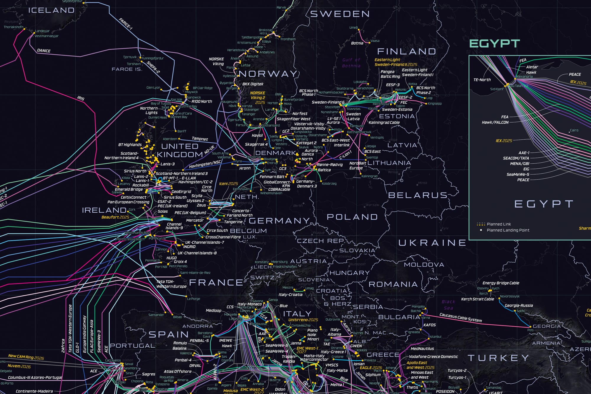 - March 2025: The PEACE submarine cable system was cut 1,450 km from Zafaranaat, Egypt, requiring several months to repair