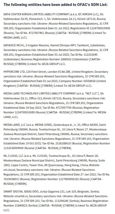On November 19, 2025, the U.S. Treasury Department’s Office of Foreign Assets Control (OFAC), in coordination with Australia and the United Kingdom, announced comprehensive sanctions targeting Media Land LLC and its entire operational network. The detailed sanctions designations named three key executives, three sister companies, and revealed the cryptocurrency wallets used to facilitate their operations.