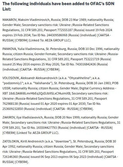 The November 19, 2025 Treasury designations exposed this evasion network in detail. Maksim Vladimirovich Makarov emerged as Aeza’s new director, making key decisions regarding sanctions evasion. Ilya Vladislavovich Zakirov helped establish new companies and payment methods to obfuscate Aeza’s continuing activity.