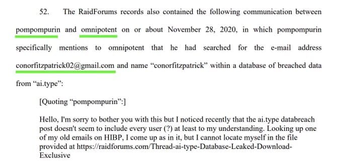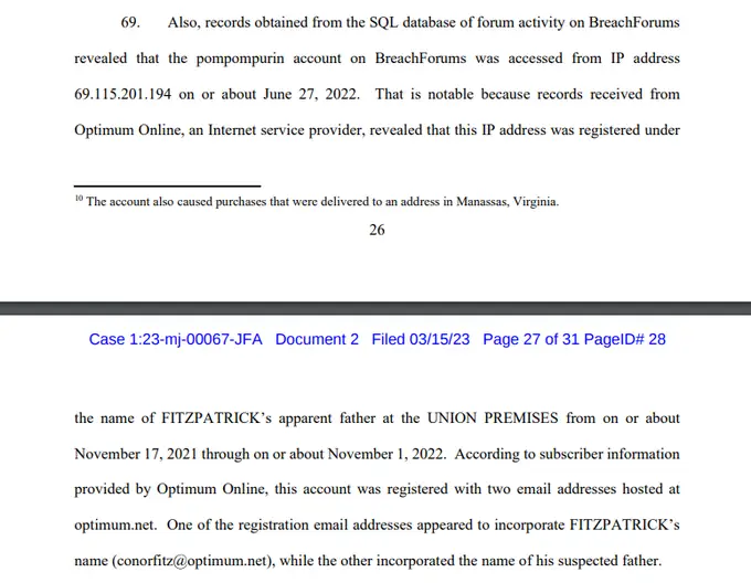 Immediate Admission: According to the FBI affidavit, when arrested, Fitzpatrick stated: “a) his name was Conor Brian Fitzpatrick; b) he used the alias ‘pompompurin/’ and c) he was the owner and administrator of ‘BreachForums.’”