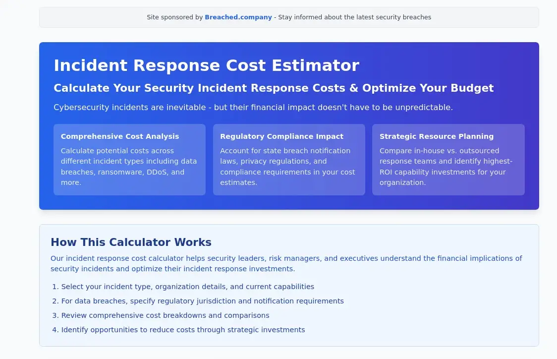 For comprehensive cybersecurity cost analysis, explore our complete suite of assessment tools: Data Breach Cost Calculator for overall breach impact modeling, Fine My Data for regulatory penalty assessment, and IR Maturity Assessment for incident response capability evaluation.