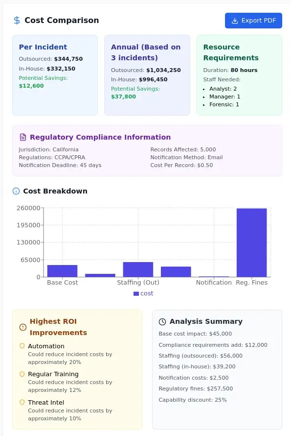 Incident Response Cost Calculator | Security Budget PlanningEstimate the financial impact of security incidents. Compare in-house vs. outsourced costs and identify highest-ROI security investments for your organization.