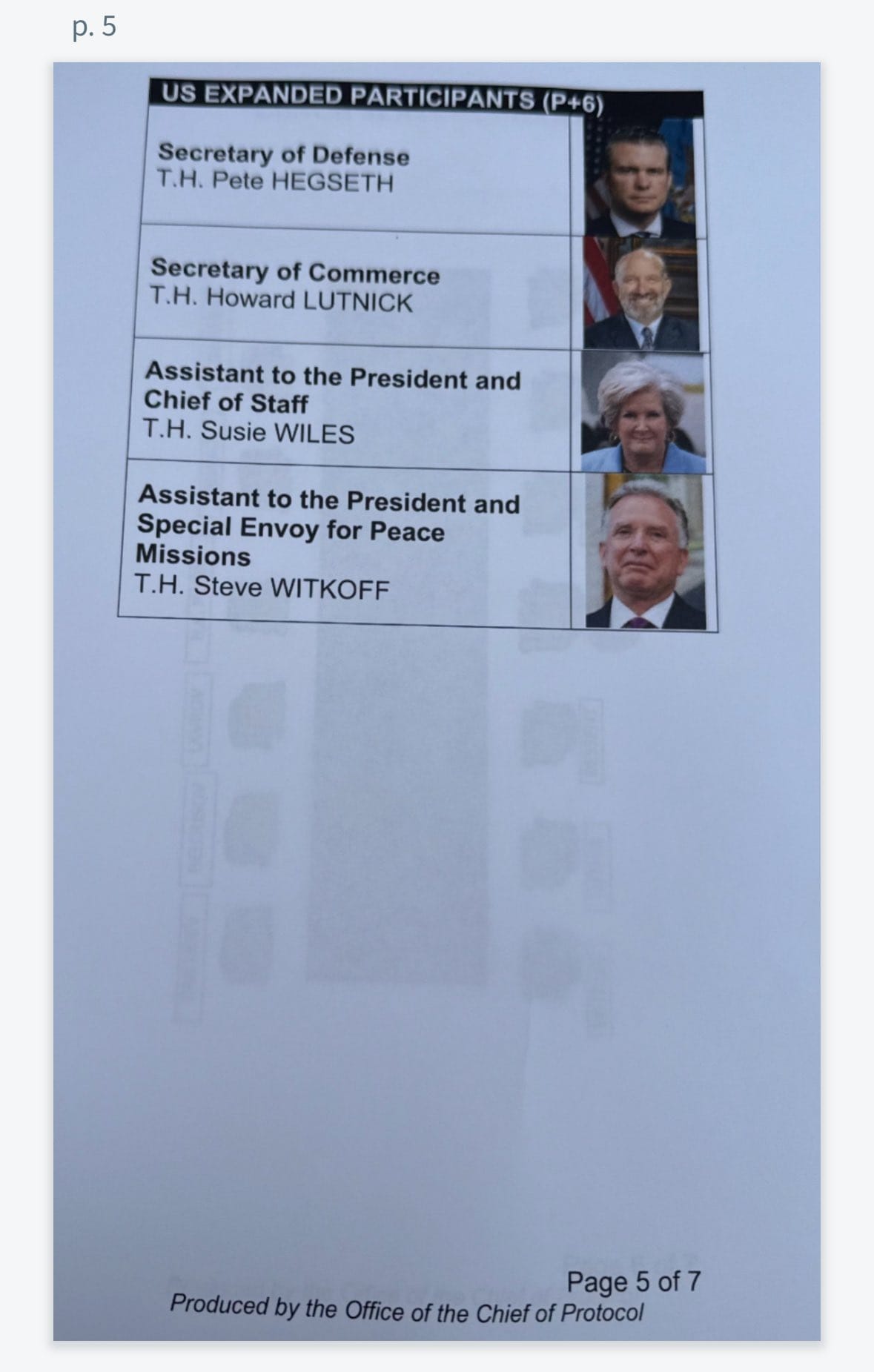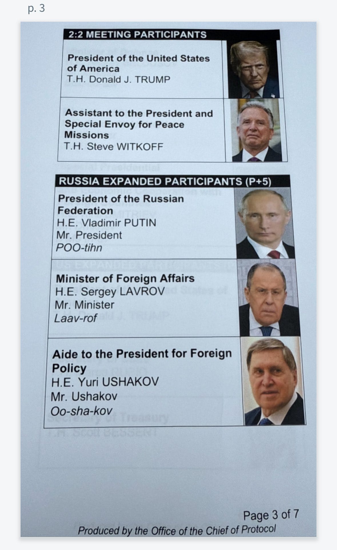 The seating arrangements revealed the diplomatic choreography planned for the meal. A seating chart shows that Putin and Trump were supposed to sit across from each other during the luncheon. Trump would be flanked by six officials: Secretary of State Marco Rubio, Secretary of Defense Pete Hegseth and White House Chief of Staff Susie Wiles to his right, and Secretary of the Treasury Scott Bessent, Secretary of Commerce Howard Lutnick and Special Envoy for Peace Missions Steve Witkoff to his left. Putin would be seated immediately next to his Minister of Foreign Affairs, Sergey Lavrov, and his Aide to the President for Foreign Policy, Yuri Ushakov.