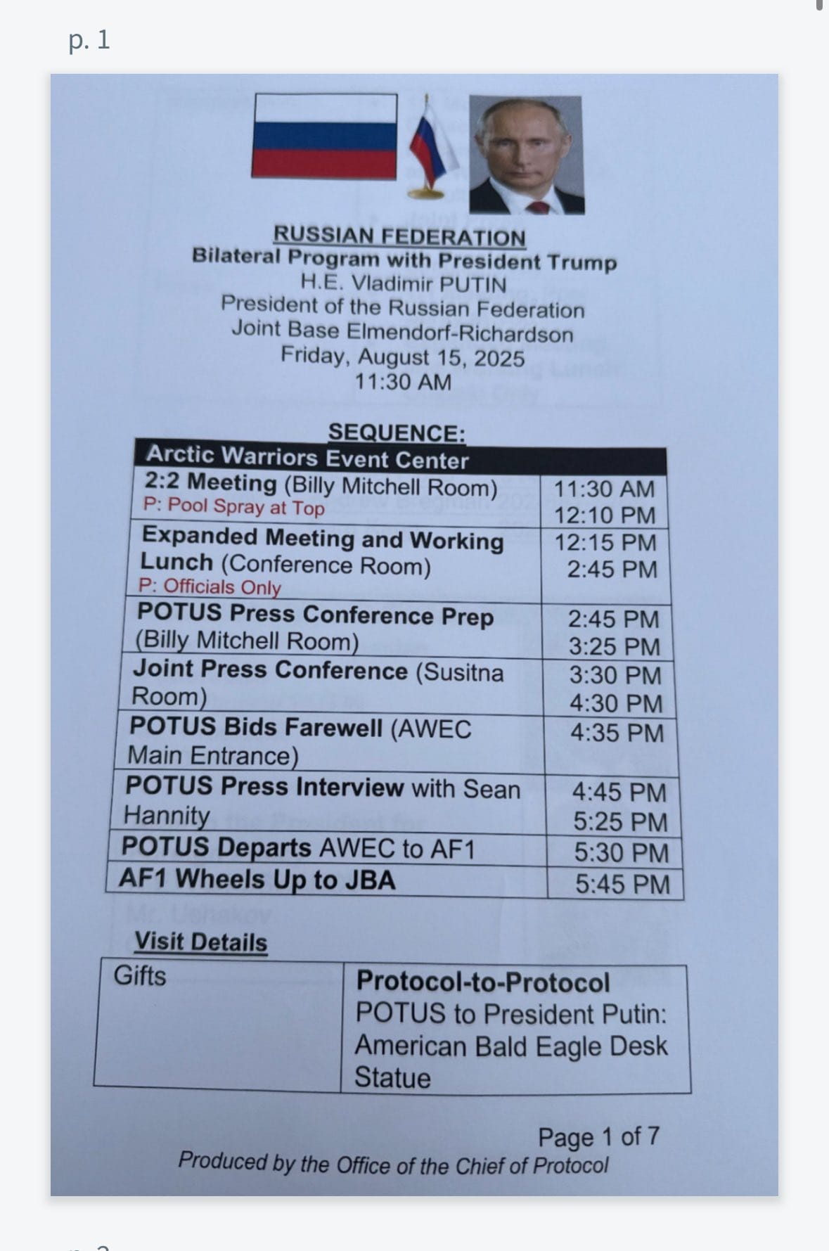 The leaked materials provided an intimate look at the summit’s logistics. The first page in the printed packet disclosed the sequence of meetings for August 15, including the specific names of the rooms inside the base in Anchorage where they would take place. It also revealed that Trump intended to give Putin a ceremonial present. That gift was to be “American Bald Eagle Desk Statue,” according to the documents.