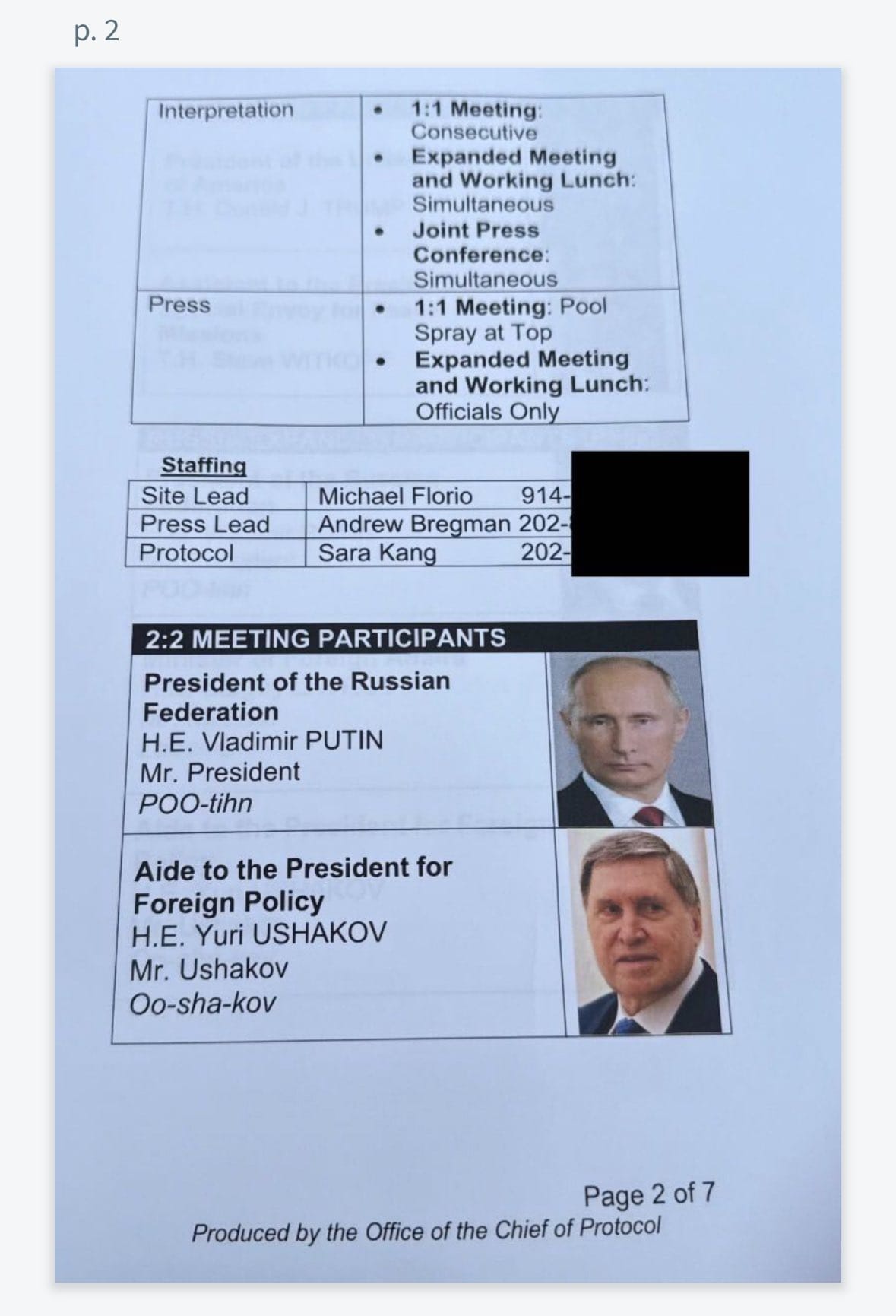 Beyond ceremonial details, the papers contained operationally sensitive information. Pages 2 through 5 listed the names and phone numbers of three U.S. staff members as well as the names of 13 U.S. and Russian state leaders. The list included phonetic pronouncers for all the Russian men expected at the summit, including “Mr. President POO-tihn.”