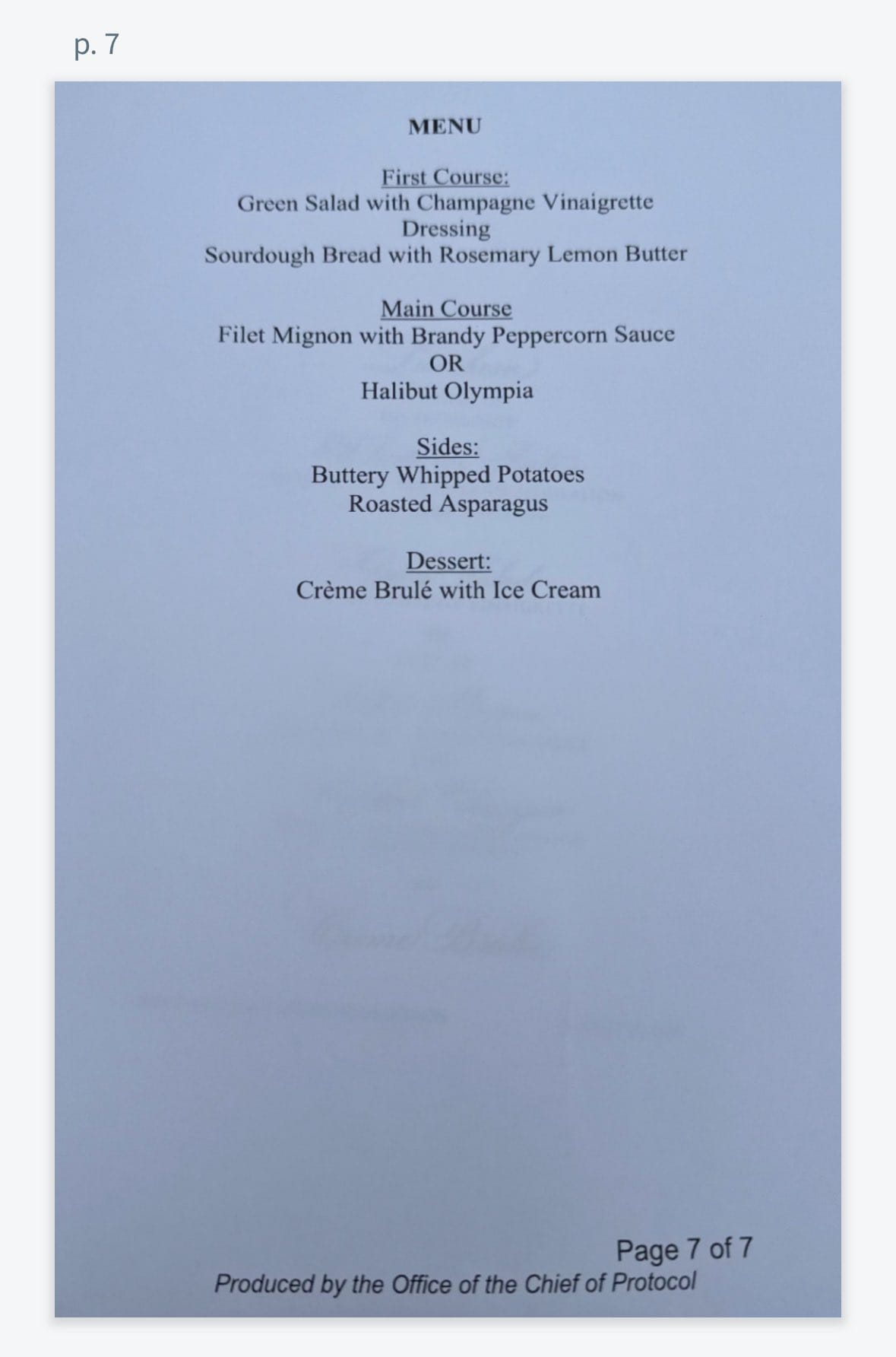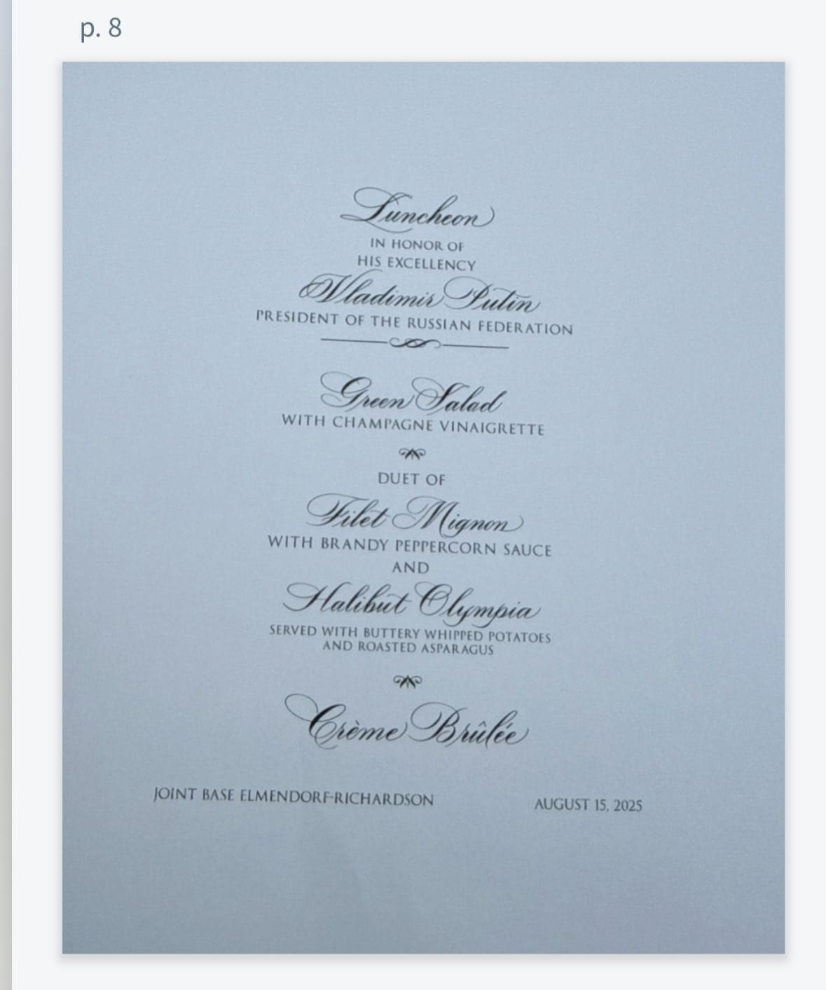 Perhaps the most detailed portion of the documents focused on a planned luncheon that ultimately never took place. Pages 6 and 7 in the packet described how lunch at the summit would be served, and for whom. A menu included in the documents indicated that the luncheon was to be held “in honor of his excellency Vladimir Putin.”