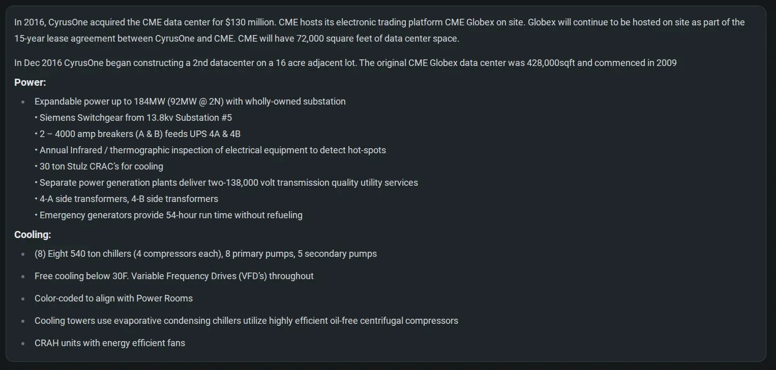 The CHI1 facility in Aurora, Illinois is part of a 450,000 sq ft campus that CME sold to CyrusOne in 2016 for $130 million in a sale-leaseback deal. The infrastructure specifications are impressive: