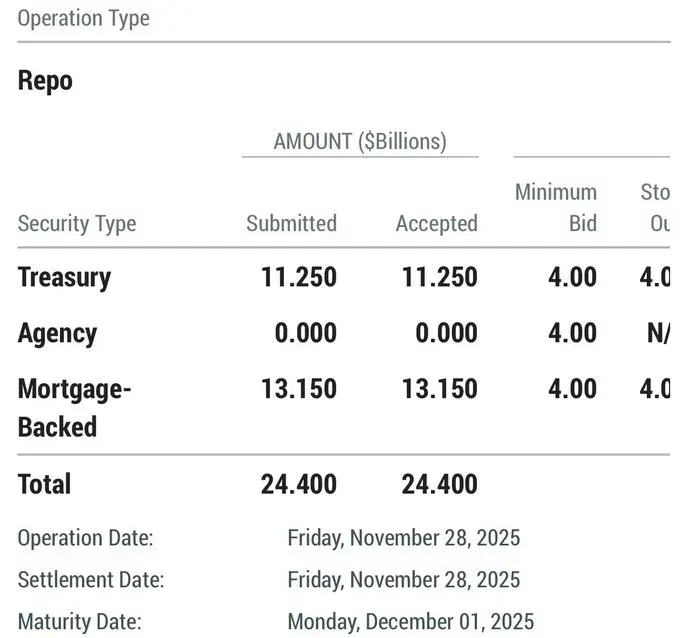 Simultaneously, banks borrowed $24.4 billion through the Federal Reserve’s standing repo facility on a shortened post-Thanksgiving trading session—a massive liquidity injection that coincided with the exchange’s “maintenance window.”