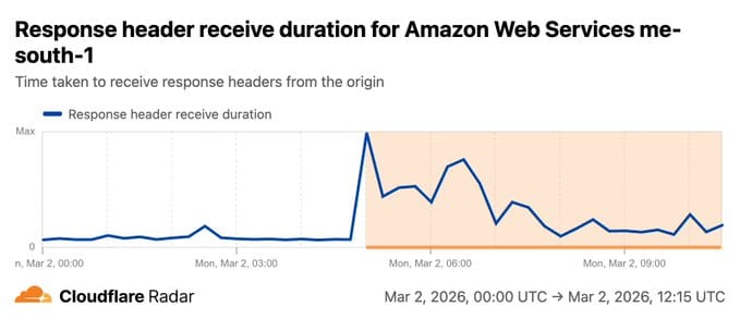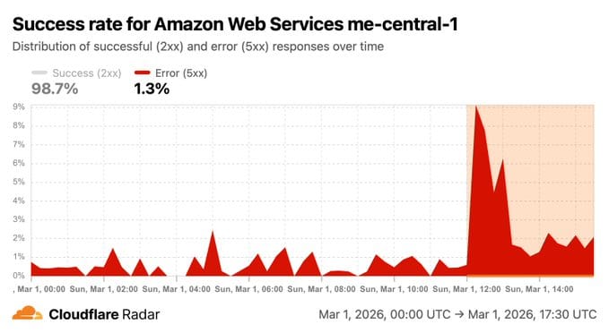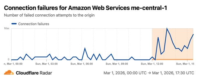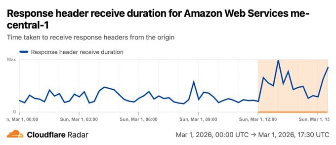 - ~12:00 PM UTC — Cloudflare Radar picks up visible spikes in error rates, connection failures, and response header receive times for ME-CENTRAL-1