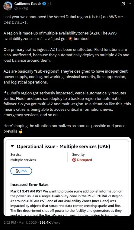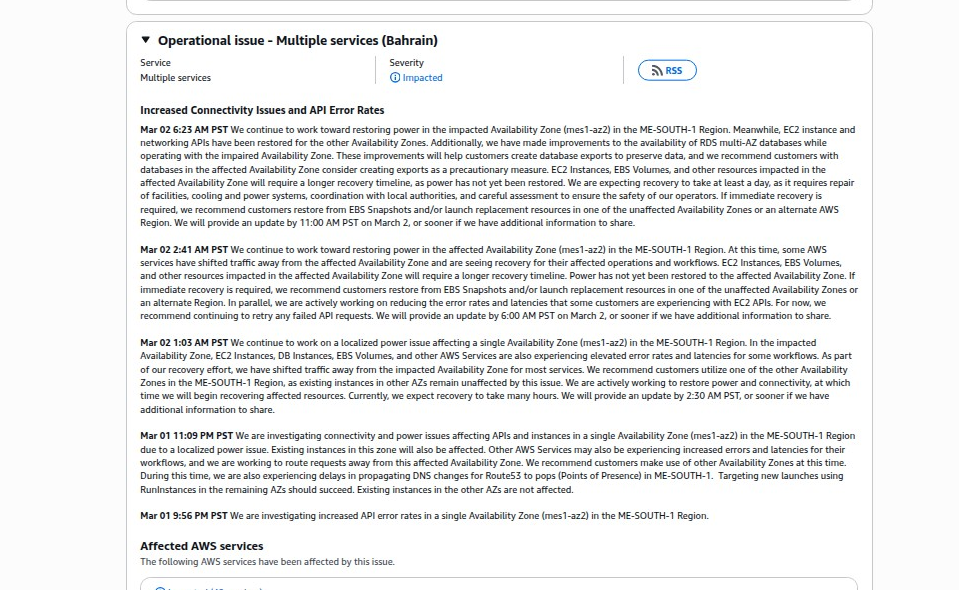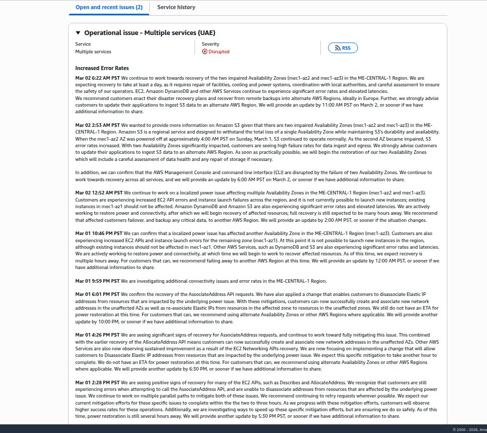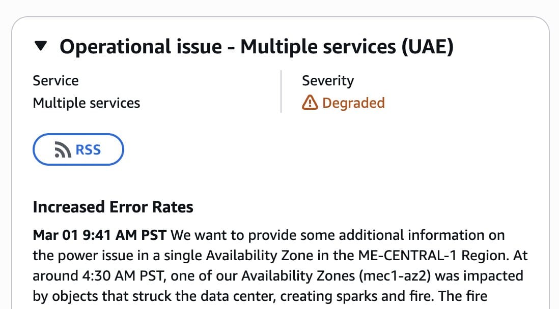 AWS customers in UAE include major financial institutions — Dubai Islamic Bank, Al Ghurair Investment — and hundreds of regional enterprises. When ME-CENTRAL-1 went dark, it wasn’t just apps going down. It was transactions failing, communications going offline, and operations grinding to a halt in the middle of an active military conflict where the internet was needed most.