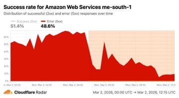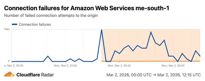 - Monday ~5:00 AM UTC — Cloudflare Radar ME-SOUTH-1 registers traffic drop-off, connection failures, and degraded response times for AWS Bahrain — a separate region now also impacted
