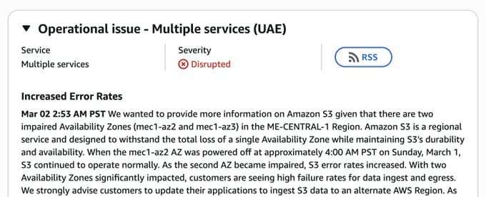 AWS designed its availability zones to be physically separate and independently powered. When one AZ fails, the others continue — by design. That worked for about 12 hours. When mec1-az3 went down due to the broader conflict impacting regional power infrastructure, the multi-AZ redundancy model broke entirely. S3 — a service specifically engineered to withstand the total loss of a single AZ — began failing at scale once two zones were offline simultaneously.