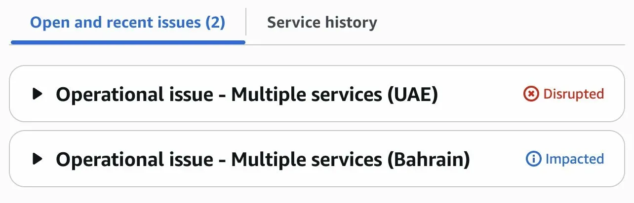 - Check the AWS Health Dashboard for current ME-CENTRAL-1 and ME-SOUTH-1 status