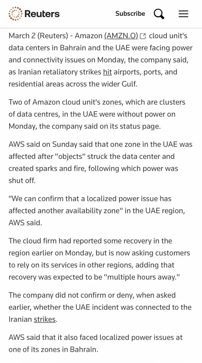 AWS neither confirmed nor denied any connection to the Iranian strikes when directly asked by Reuters. Corporate language is what it is. The timeline and geography speak for themselves.